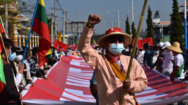 Banner image: Anti-coup protester wears mask to protect against transmission of COVID-19, Taunggyi, Myanmar - February 20, 2021. Credit: R. Bociaga, Shutterstock.