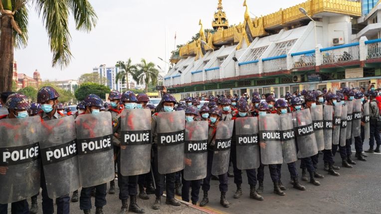 Banner image: Riot police form wall, Yangon, Myanmar - February 6, 2021. Credit: Shutterstock.